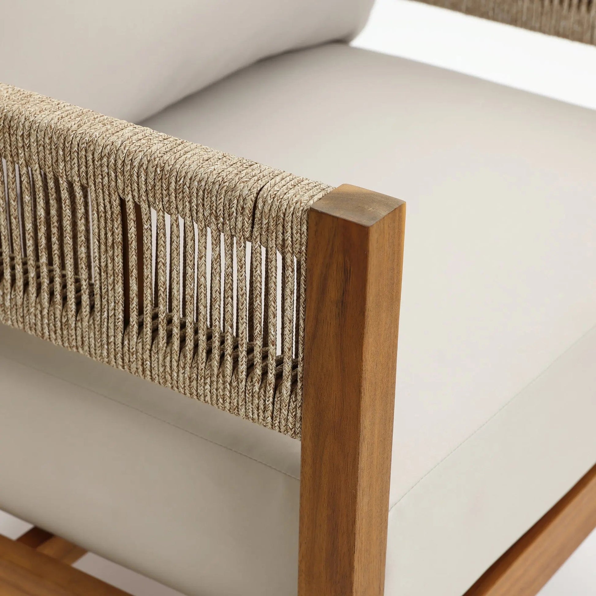 The acacia wood frame provides strength and natural resistance to outdoor use. Rope details on the armrests add texture and support. The coffee table features a slatted surface for water drainage and rounded corners for safety.